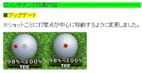 8月31日のメンテナンスで… とのことですが、ストローク快は短時間で遊べるので、とても重宝しています。 で、どうせ直すのなら、 (1)800×600の解像度でも以前のように他のプレイヤーを見れるようにして下さい。 (2)ついでにアプローチのときの他のプレイヤーのクラブを正確に描画して下さい。 (3)ごく希にスコアー(打数)の計算がおかしくなりますので改善して下さい。 (4)ついでのついでにストローク並みの経験値をつけては如何でしょうか? つい要望じみた事も書いちゃいましたが、1日も早い再実装をお願い申し上げます。 と、、、こんなところに書いても意味ないですネ! 寝よっと…。 |